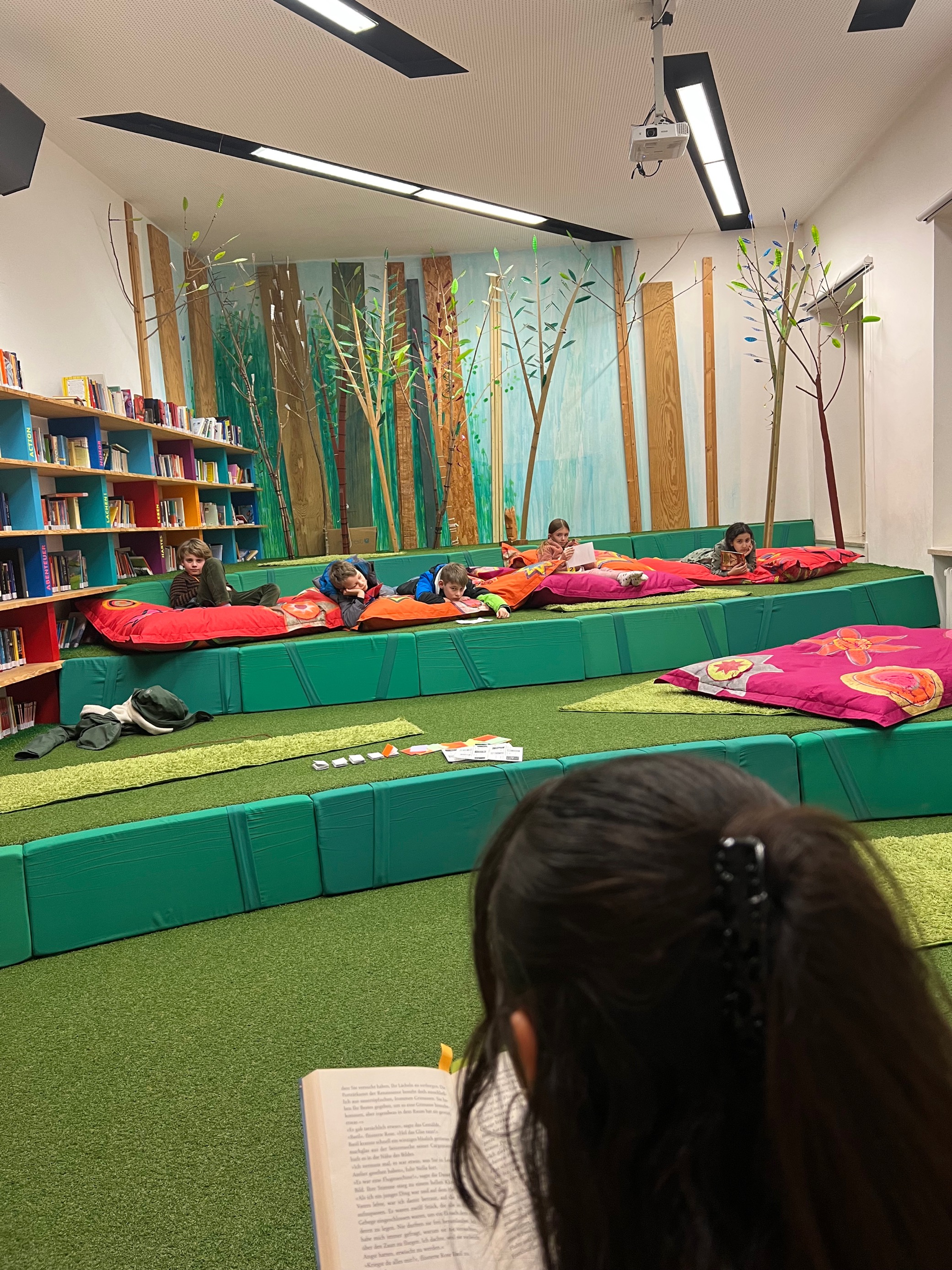 Nachts scheint sogar der Mond über dem dunklen Wald. Alle (Bau-)Arbeiten führten Schüler und Lehrer gemeinsam mit unserem Projektbegleiter Hr. Käser und dem Architekten aus. Finanziert wurde das Projekt mit Elternspenden und einem Zuschuss aus einem Leseförderprogramm. Eltern von Holbein-Schülern sorgen ehrenamtlich für die Öffnung des Mediengartens am Vormittag. Unsere „Mediengärtnerinnen“, die dort in den Pausen am Vormittag aufpassen kann man ansprechen, falls ein gutes Buch fehlen sollte! Das Holbein kauft das Buch dann.