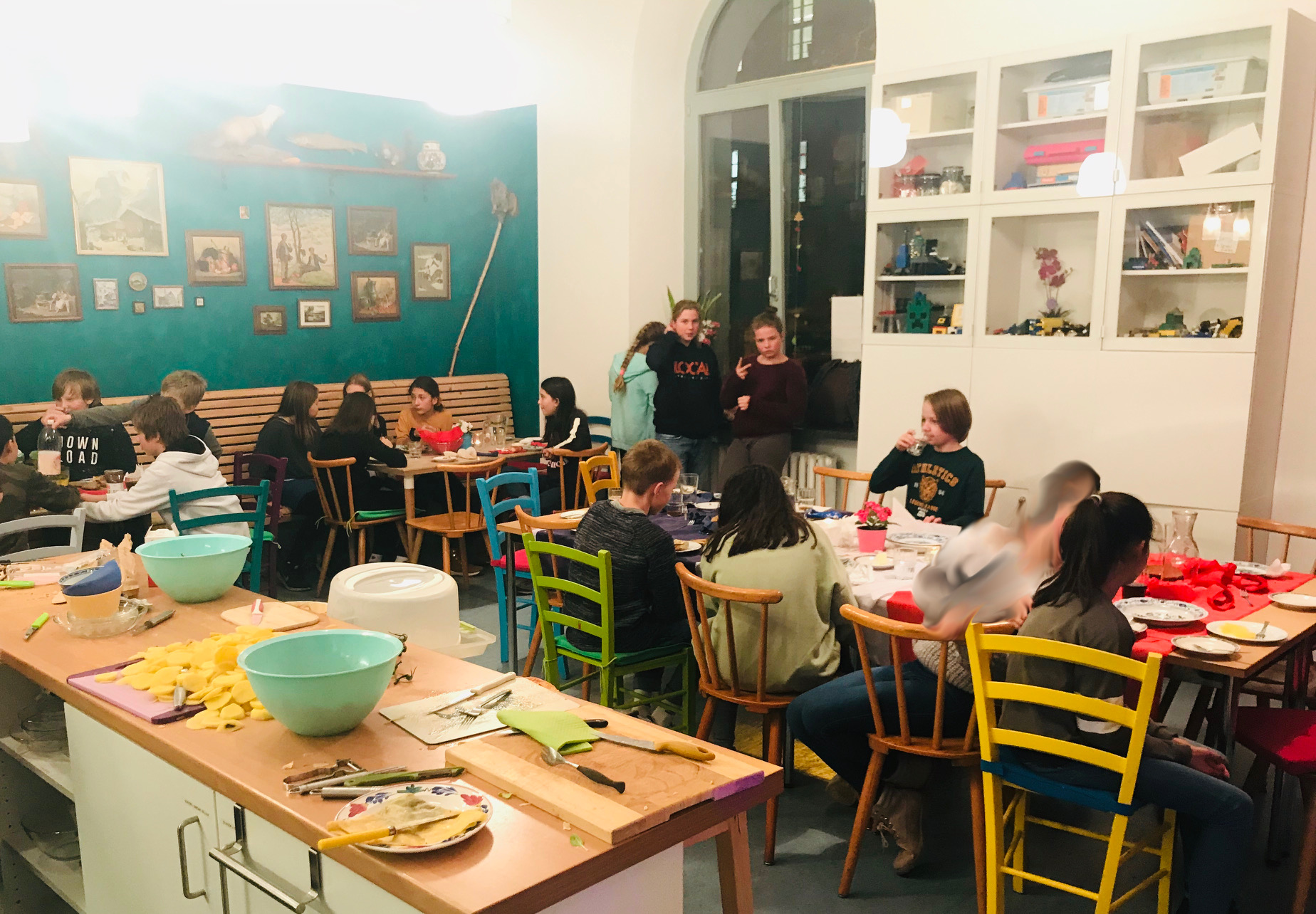 Am Abend trafen sich alle zur Vorbereitung. Zum einen gab es die Freiwilligen, die für die Dekoration verantwortlich waren, zum anderen die, die in der Küche halfen. Jeder brachte eine Köstlichkeit mit, oder auch nur die Zutaten hierfür: zum Beispiel Crêpes-Teig für die salzigen und süßen (Pfannkuchen), Quiches, Macarons, und viele andere Sachen, nicht nur französisches…