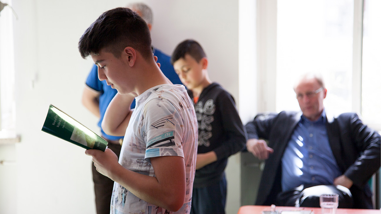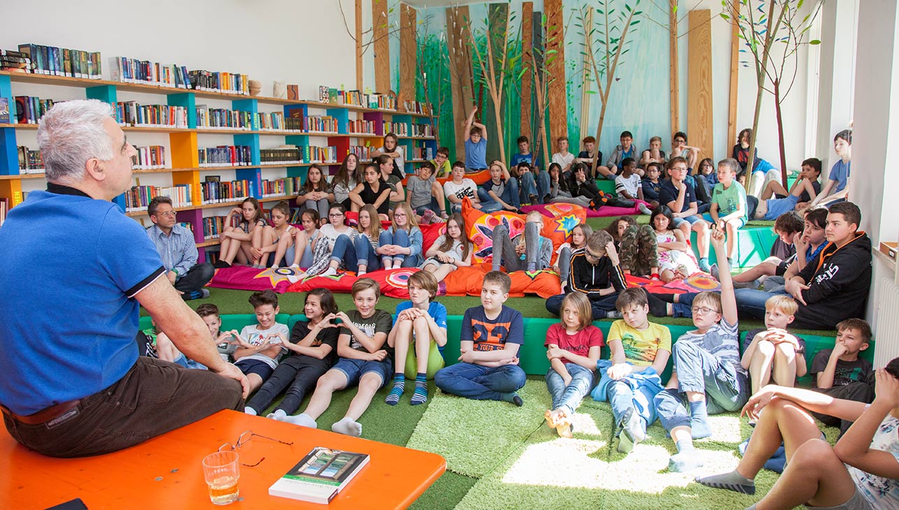 Zu den Traditionen unserer Schule gehört es, dass der Dichter Nevfel Cumart jedes Jahr für die Schülerinnen und Schüler der 6. Klassen eine Lesung hält. Er begeisterte einmal mehr seine Zuhörer mit seinen Texten, aber auch mit seiner lebendigen, offenen und zugewandten Art. Er ließ sich wie immer auf sein Publikum ein und stellte sich den neugierigen Fragen der Jungen und Mädchen.
