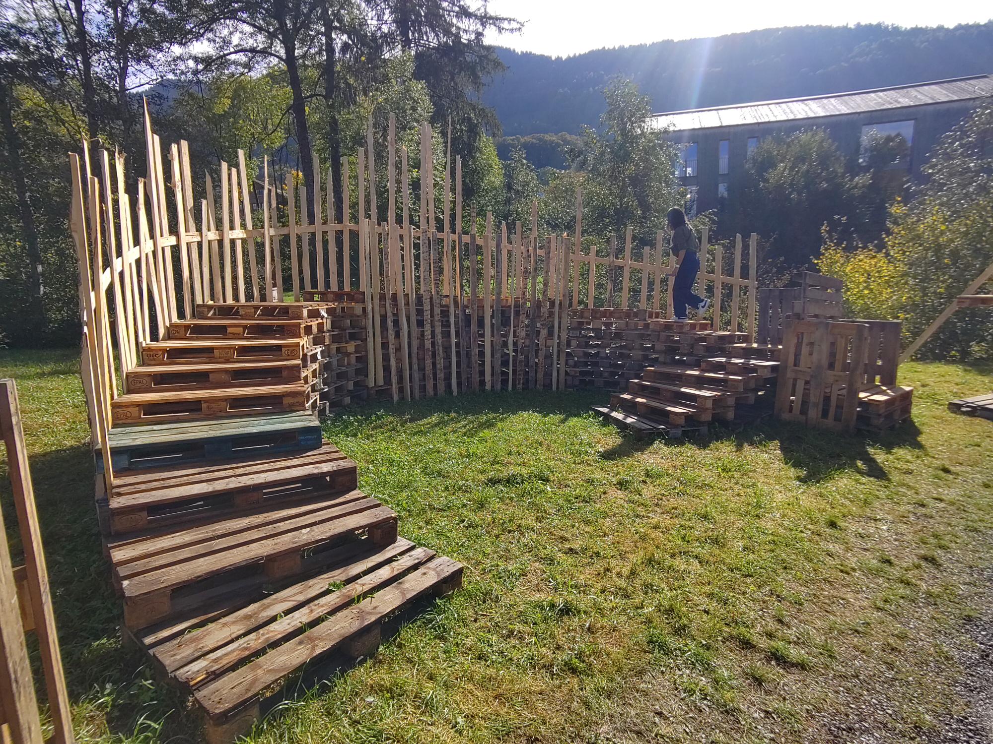 Der zweite Teil der Exkursion führte in die Gemeinde Krumbach. 2010 wurden auf dem Gemeindegebiet 7 innovative Bushaltestellen im Rahmen eines internationalen Architekturwettbewerbs entworfen und mit lokalen Handwerksbetrieben errichtet und als bus:stop einen touristischen Bekanntheitsgrad erreicht. Sind diese Bushaltestellen originelles design oder schon Kunst? Die Schülerinnen und Schüler konnten an allen Stationen diese Überlegungen vor Ort ausprobieren und miteinander diskutieren. Wieviele Wartende passen in eine Station?