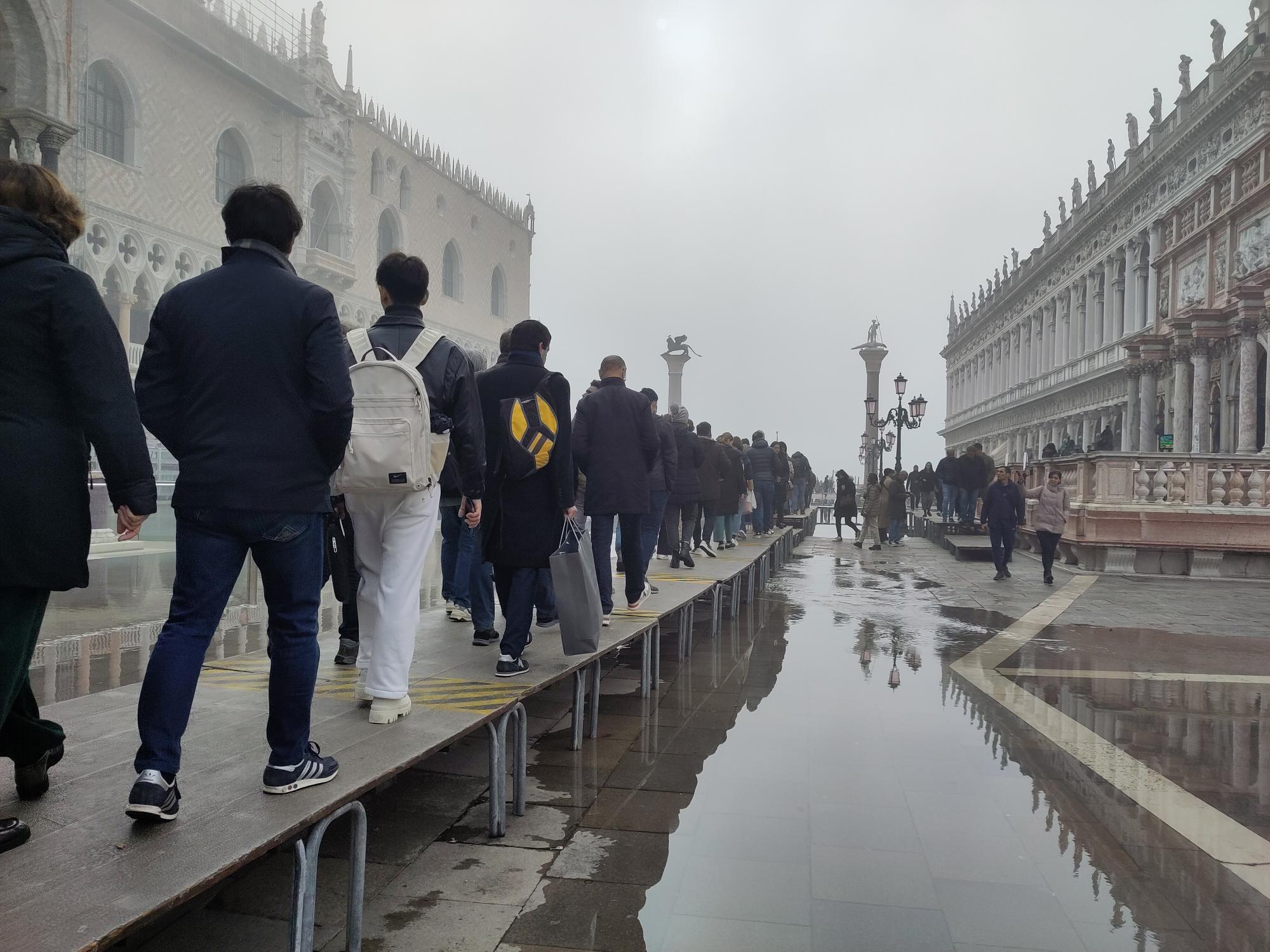 Am nächsten Morgen aber stand der Markusplatz und ein guter Teil der Gassen unter Wasser. Bei einem Meeresspiegelanstieg von knapp 0,5 Meter war das Ausstellungsgelände für uns nicht mehr trockenen Fußes erreichbar. Eine Fahrt mit dem Wasserbus durch den Canale Grande löste das Problem.