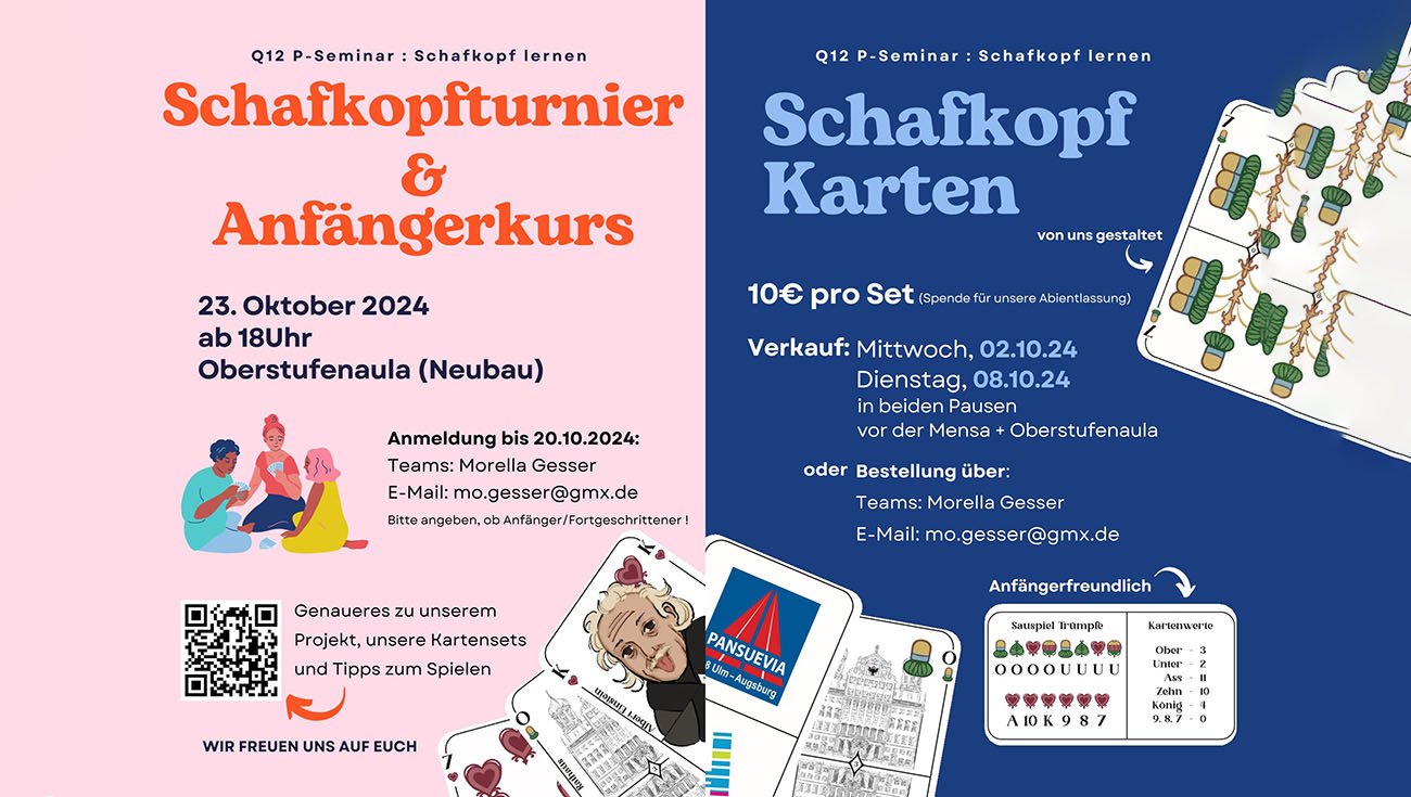 wir, das P-Seminar Schafkopf, laden Euch herzlich zu unserem großen Schafkopfturnier und unserem Anfängerkurs ein! Schafkopf ist nicht nur eines der beliebtesten Kartenspiele Bayerns, sondern auch ein Stück Kultur, das wir an unserer Schule mit Euch allen teilen möchten.