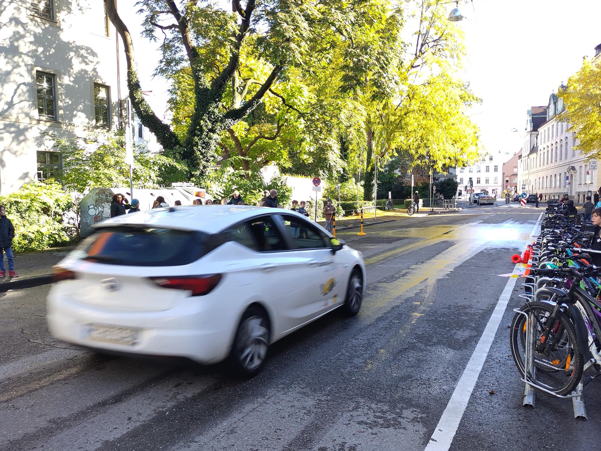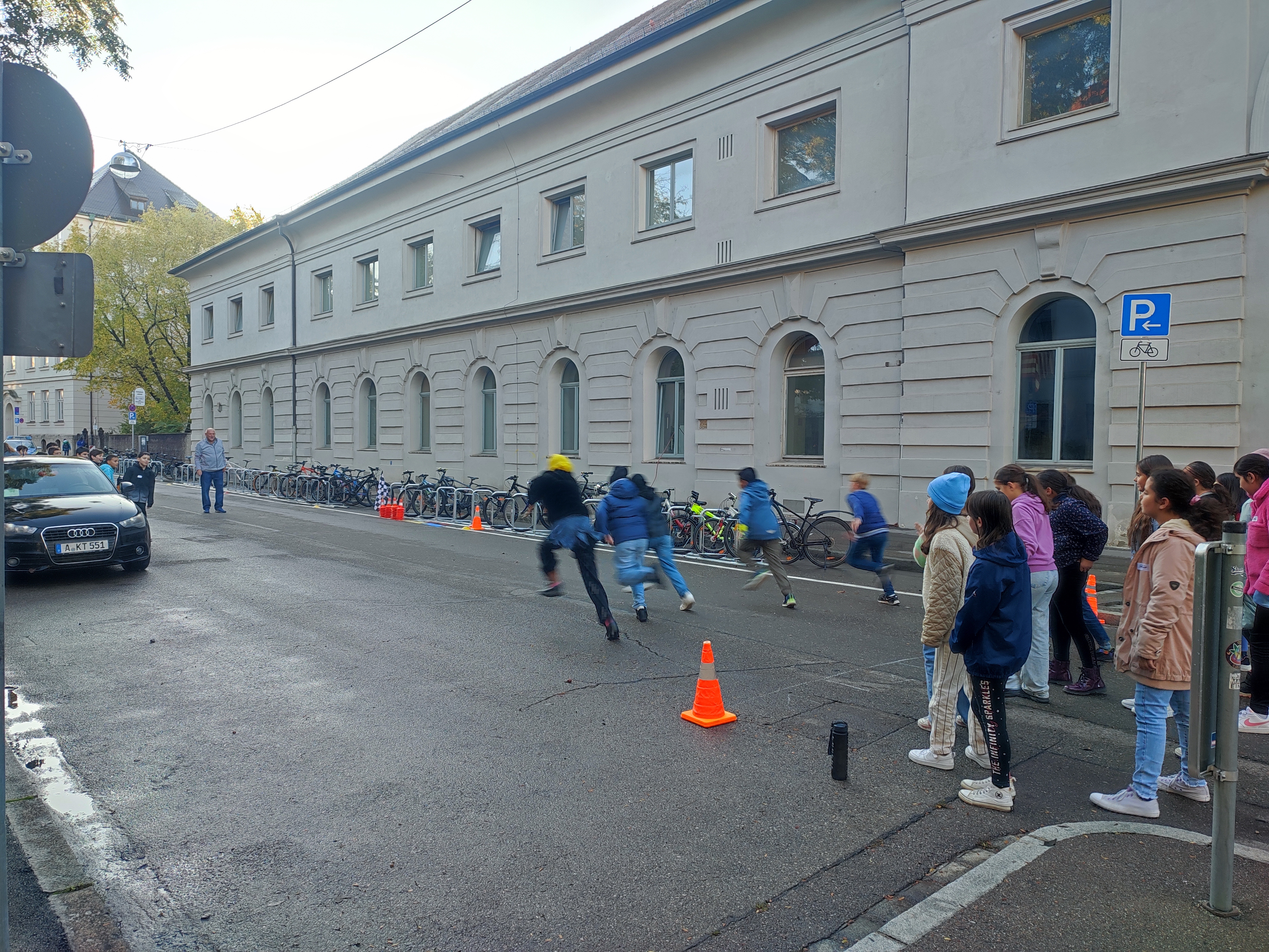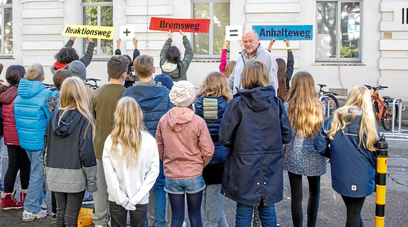 Beim Training „Achtung Auto“ wurden unter anderem Start-Stop-Spiele durchgeführt, um die Bedeutung des Bremswegs hautnah zu erleben. Ein Höhepunkt war die Vollbremsung bei 30 km/h, die auf der extra dafür gesperrten und bewässerten Hallstraße durchgeführt wurde. Jede Schülerin und jeder Schüler konnte im Auto miterleben, wie es sich anfühlt, wenn ein Auto bei 30 km/h eine Vollbremsung durchführt und vor allem wie lang der Anhalteweg des Autos dauert. Allen war schnell klar: ein aufmerksamer Blick nach links und rechts ist beim Überqueren der Hallstraße deutlich wichtiger als ein Blick auf den Hefteintrag der letzten Stunde, um für die nächste Abfrage vorbereitet zu sein.