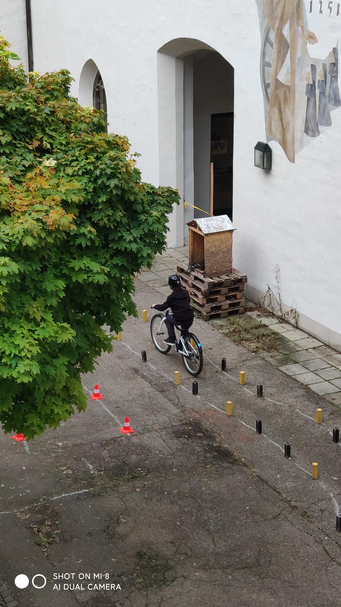 Zusätzlich fand ein Fahrradparcours im Innenhof des Altbaus statt, bei dem unter anderem Geschicklichkeitsübungen auf dem Fahrrad durchgeführt wurden und bei dem die Schülerinnen und Schüler verschiedene Stationen des Parcours durchlaufen mussten. So verbesserten sie den Umgang mit ihrem eigenen Fahrrad und lernten Hindernisse im Verkehr frühzeitig zu erkennen und möglichst zu vermeiden.