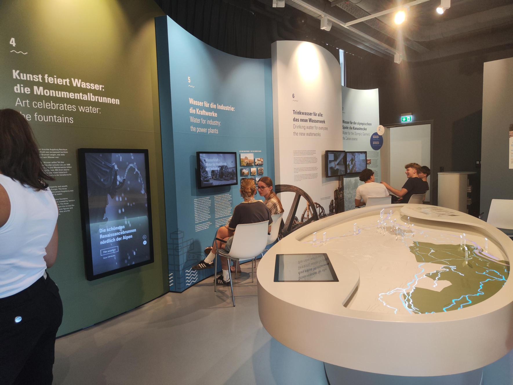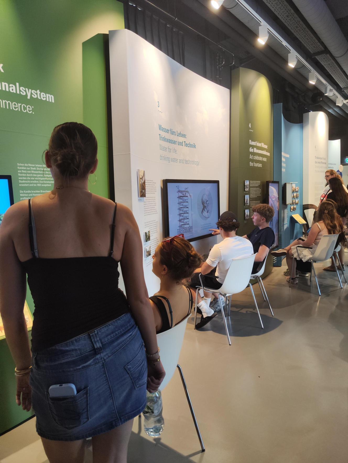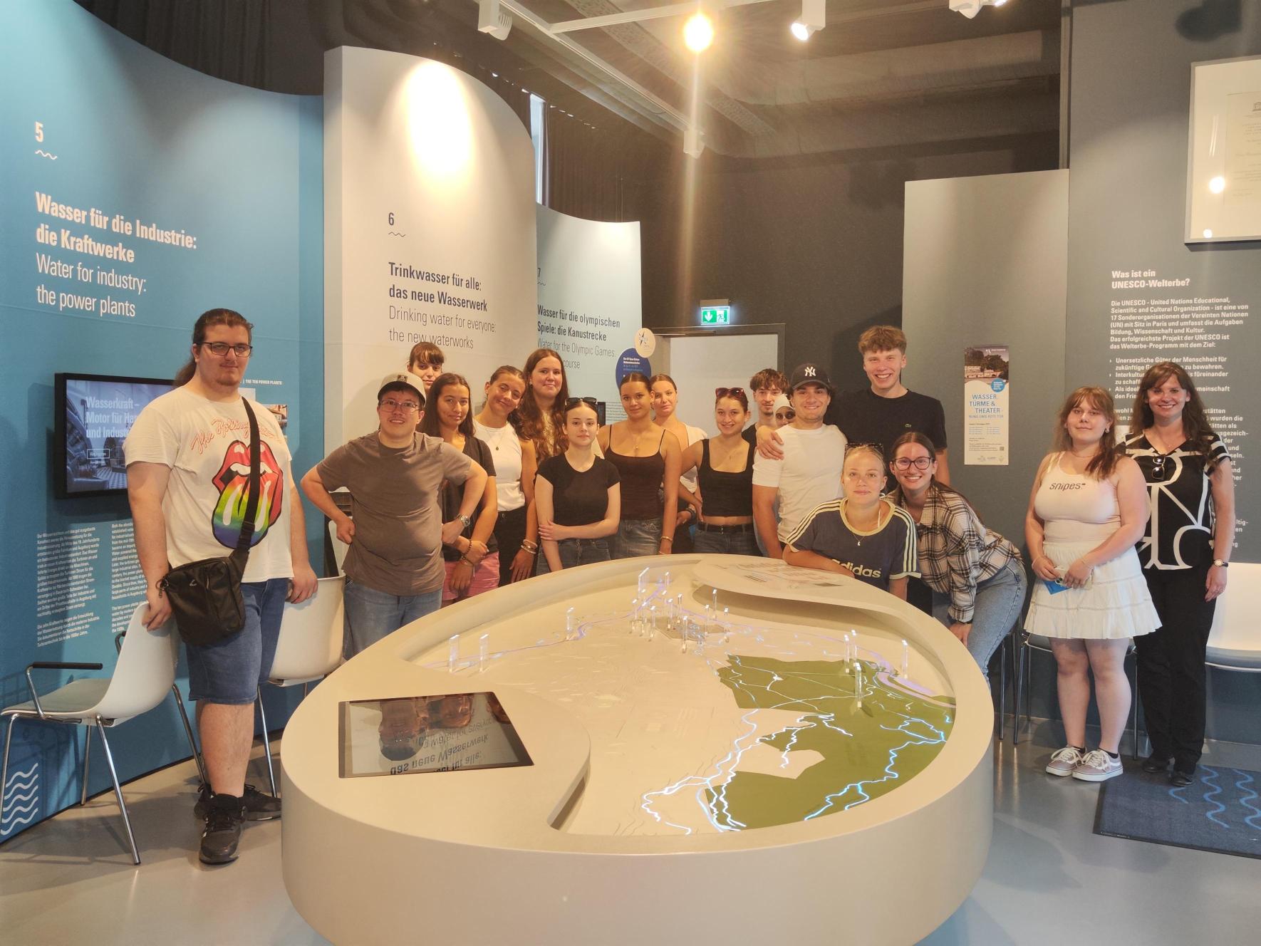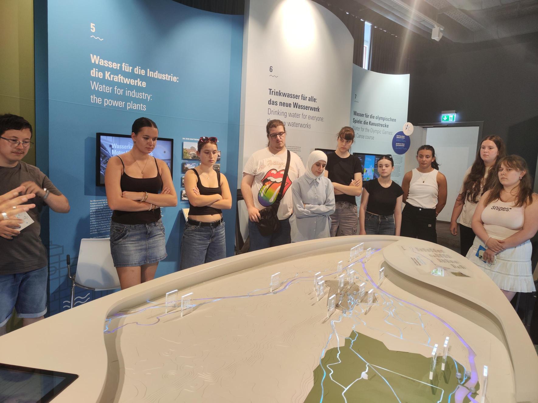 Im Welterbe-Infozentrum tauchte der Kurs dann noch tiefer ein – im wahrsten Sinne des Wortes. Ein dreidimensionales Modell des Wassersystems veranschaulichte eindrucksvoll die technischen Herausforderungen, etwa den Höhenunterschied von bis zu 20 Metern zwischen Stadt und Hochterrasse. Dabei wurden Aspekte wie Trinkwasserversorgung, Energiegewinnung und touristische Nutzung – vom Eiskanal bis zur Olympiastrecke – anschaulich beleuchtet.