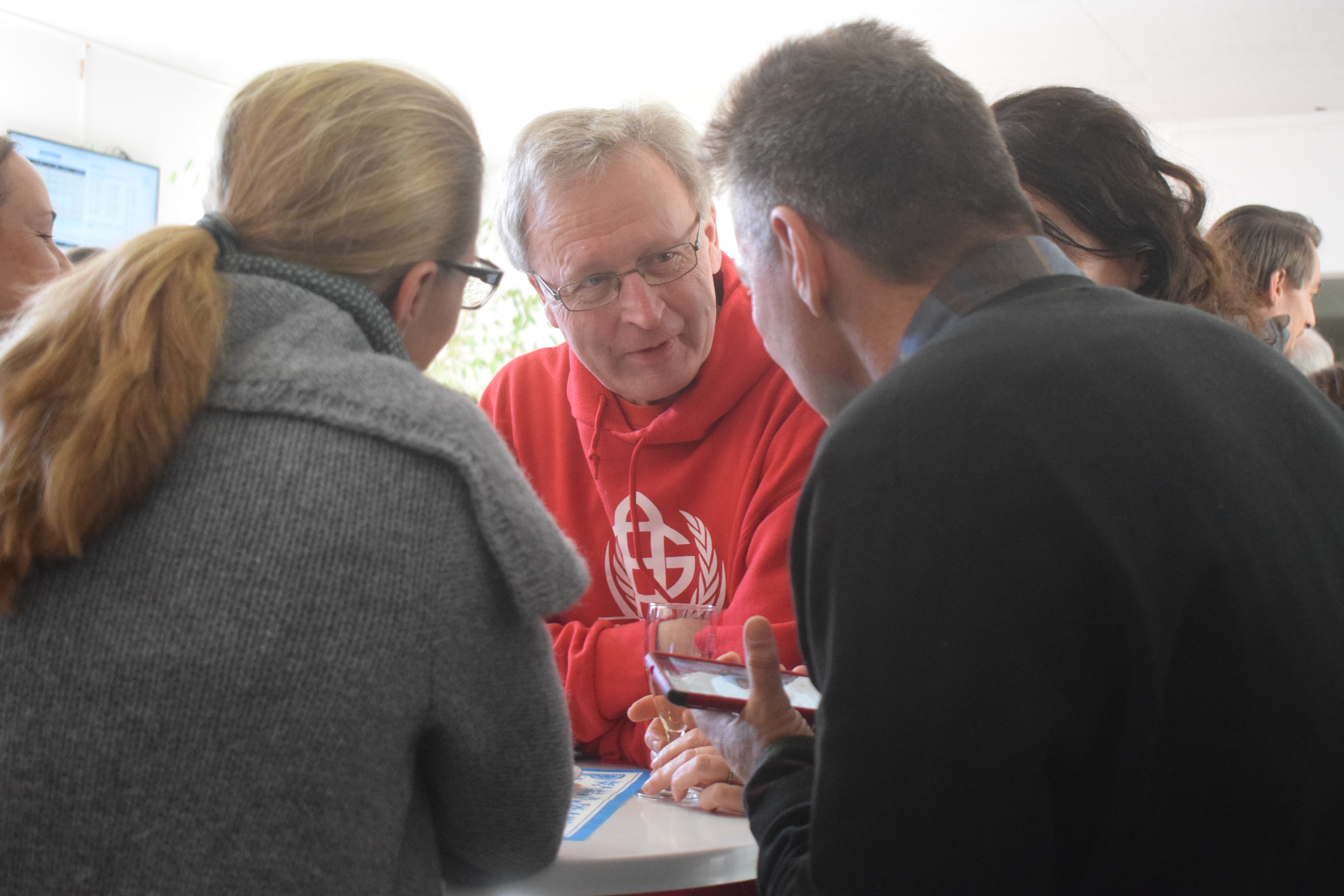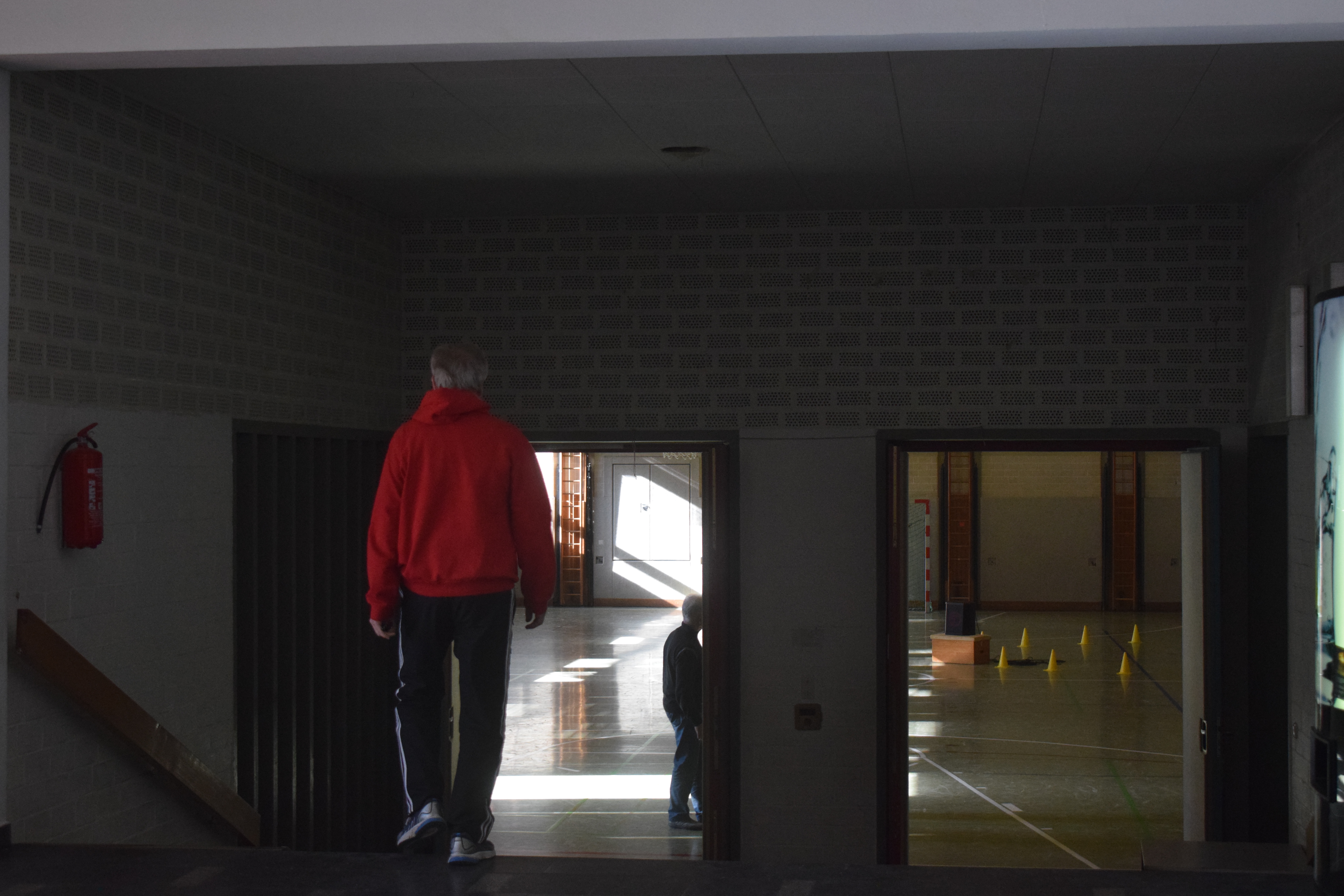 Diese euphorische Begrüßung war jedoch nur der Anfang seiner Verabschiedung. Der wesentlich längere Teil fand nachmittags und abseits der Schülerschar statt. Nach dem vorzeitigen Unterrichtsschluss fanden sich das Kollegium und Herr Schuhknecht – mit rotem Holbeinhoodie und Sporthose ein reichlich ungewohnter Anblick - zum Sektempfang im Erdgeschoss des Neubaus ein. Seine Abschiedsgeschenke, unter anderem das von Klassen und Kursen angefertigte Fotoalbum, sollte er sich nämlich bei verschiedenen sportlichen Wettkämpfen in der Neubauturnhalle erspielen.