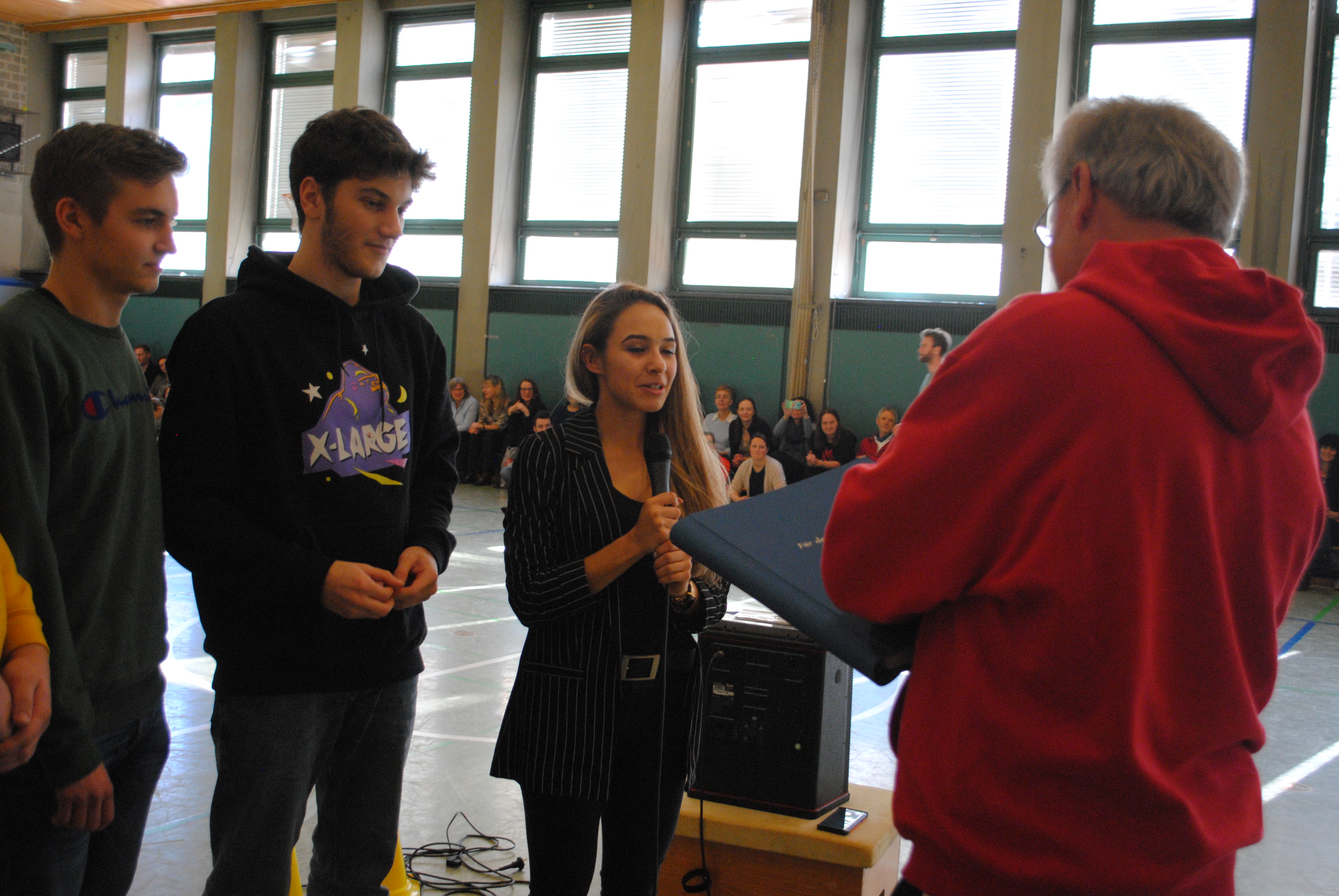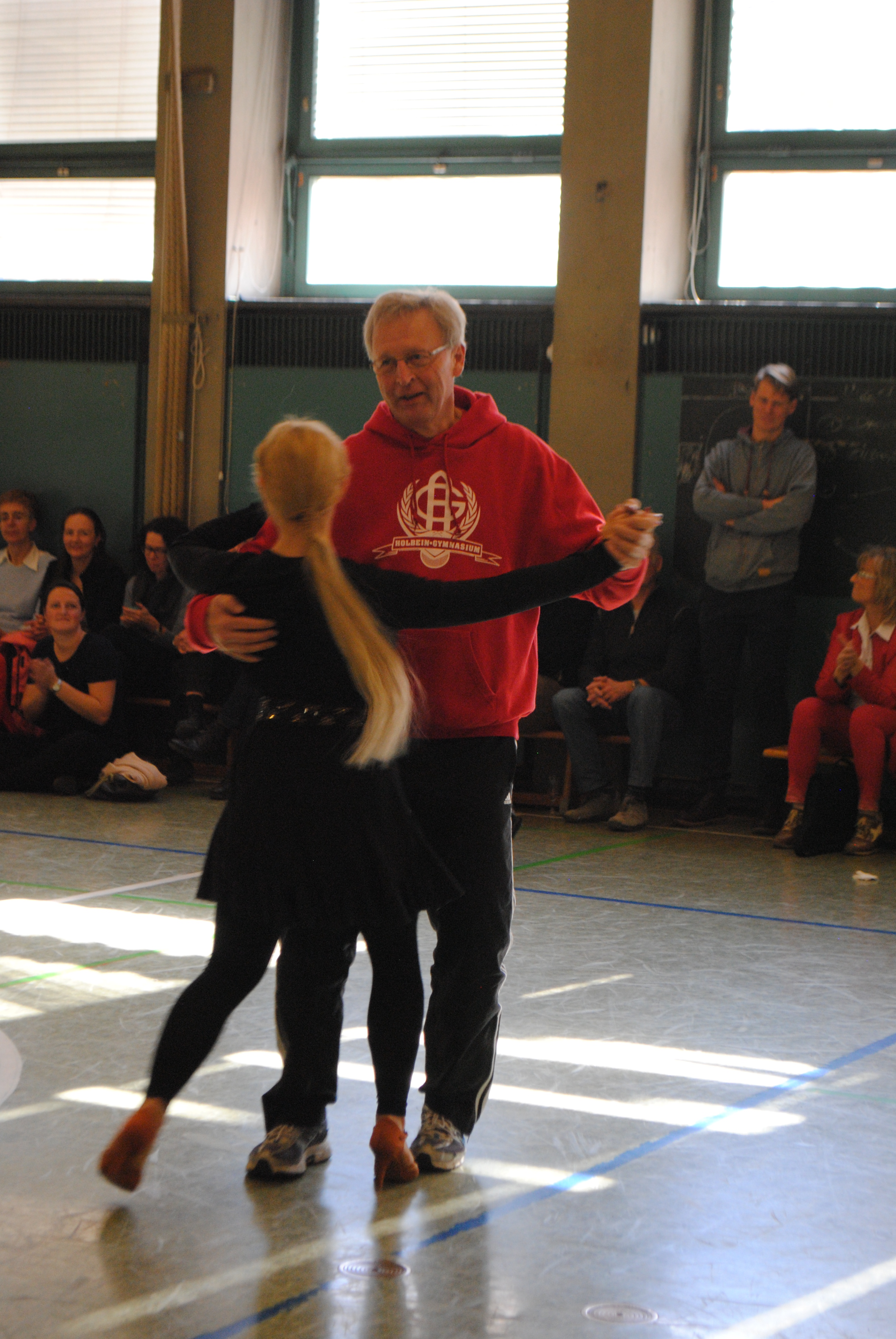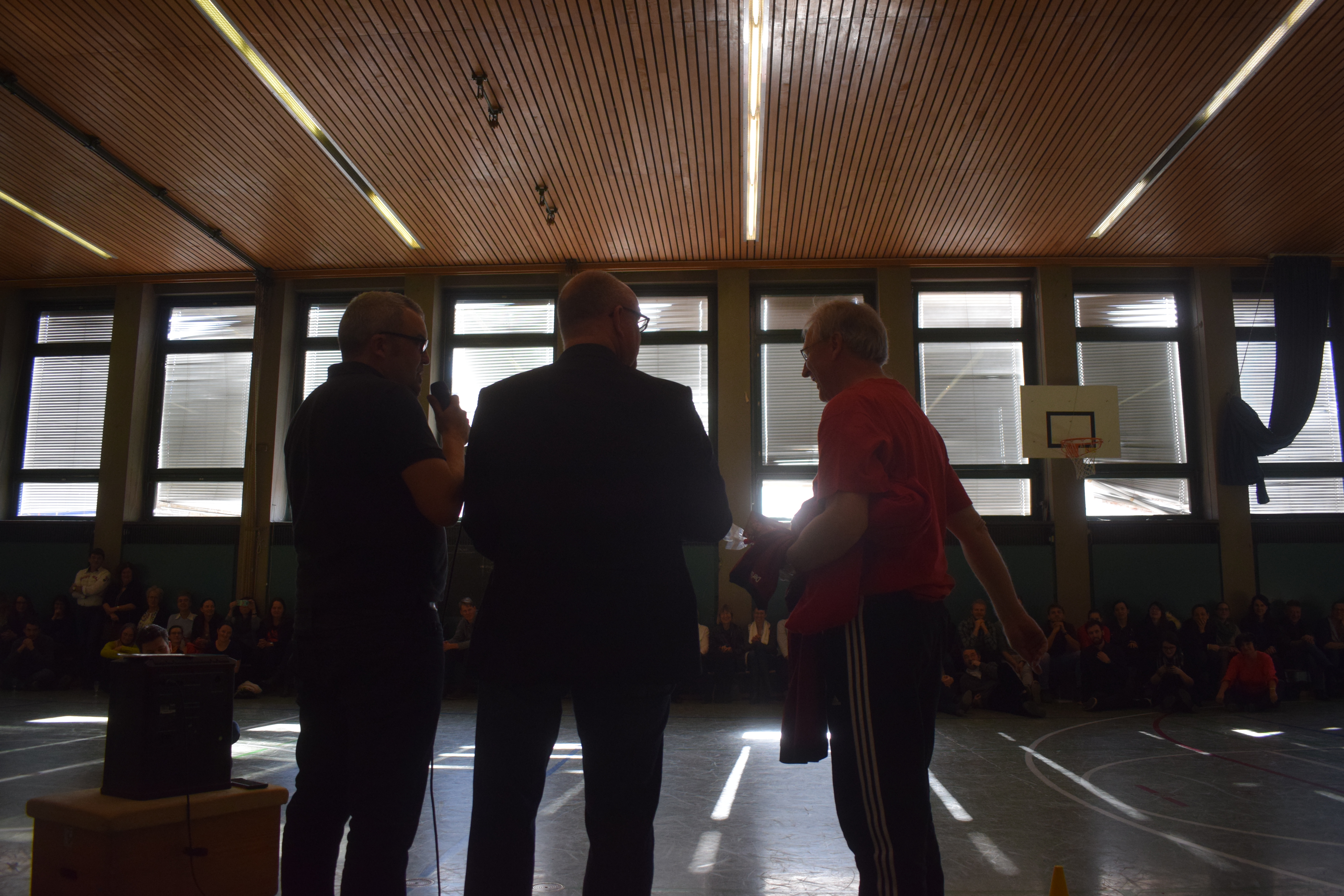 Unter der Moderation von Herrn Gangloff maß sich Herr Schuhknecht mit Herrn Fiedler im Körbewerfen, schoss 11-Meter gegen Herrn Hildensperger, zog (zusammen mit starken Frauen aus dem Kollegium) am Seil und stellte an Seite einer professionellen Tänzerin und ehemaligen Holbeinschülerin seine Tanz-Skills vor einer Jury (bestehend aus Herrn Stief, Herrn Link und Herrn Fiedler) unter Beweis. Als der sichtlich gerührte Sieger dann schließlich seine Preise entgegengenommen hatte, verlagerte sich die Veranstaltung in den Theaterraum im Altbau, wo eine Aneinanderreihung von Präsentationen, Film- und Livebeiträgen wartete.