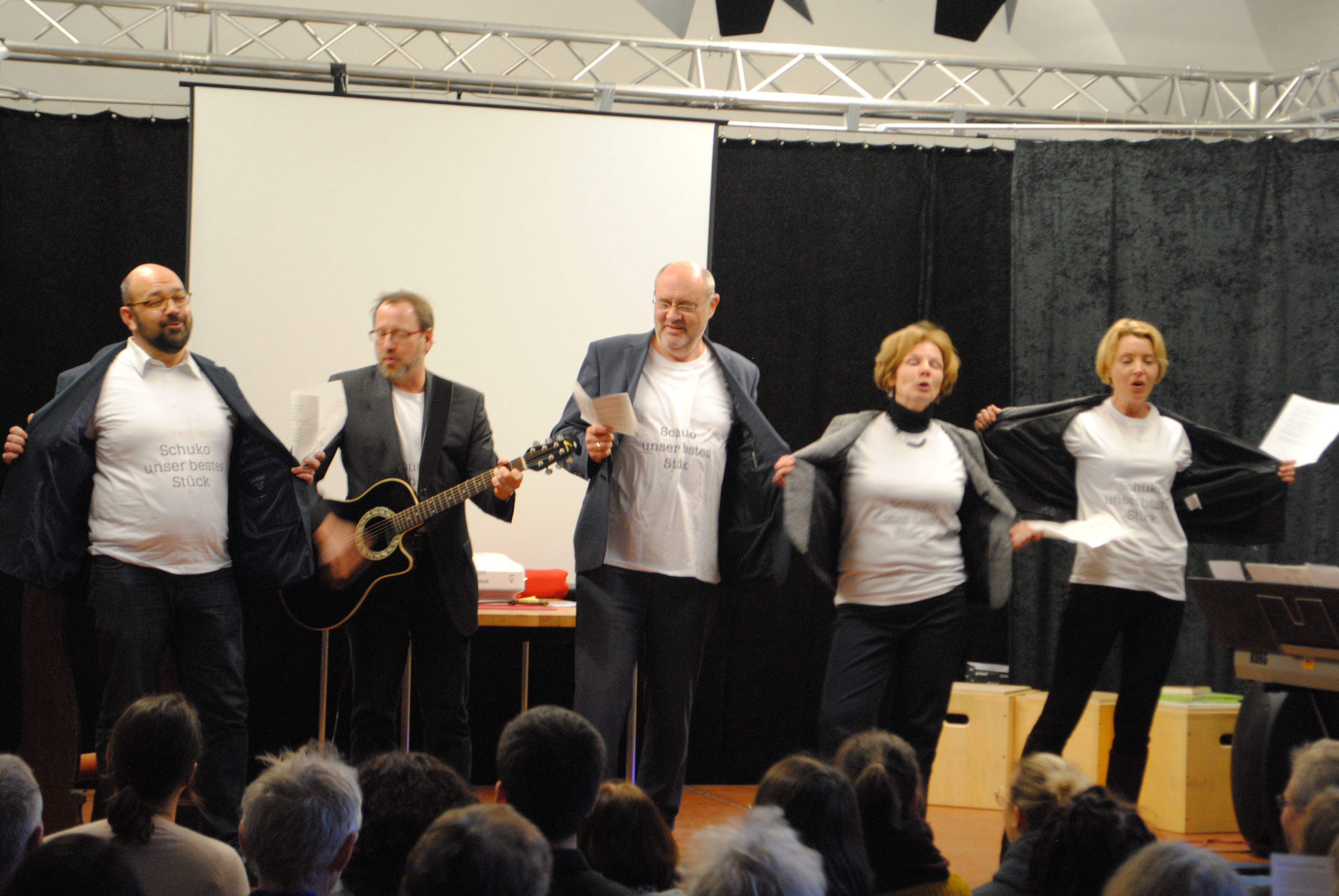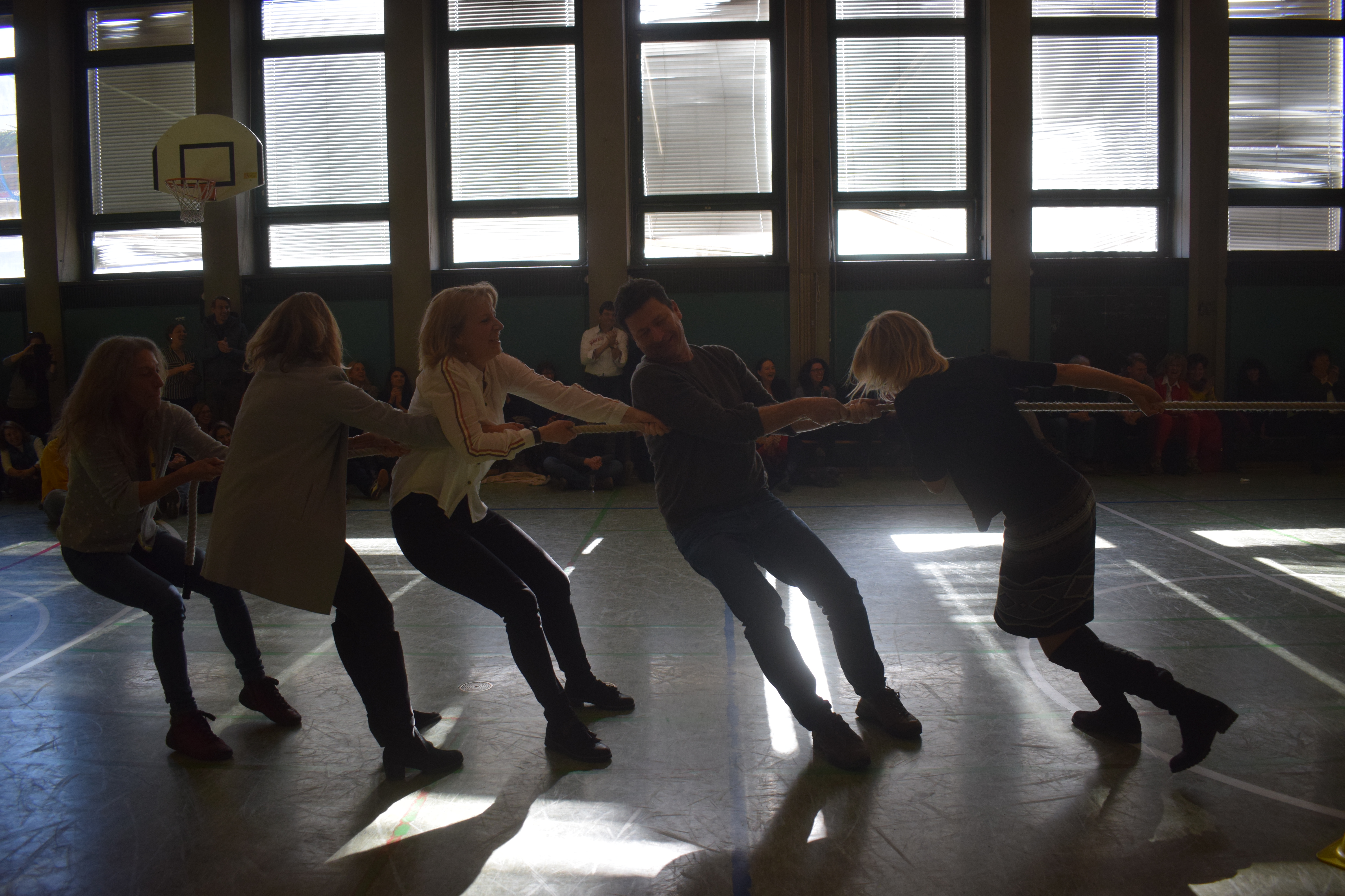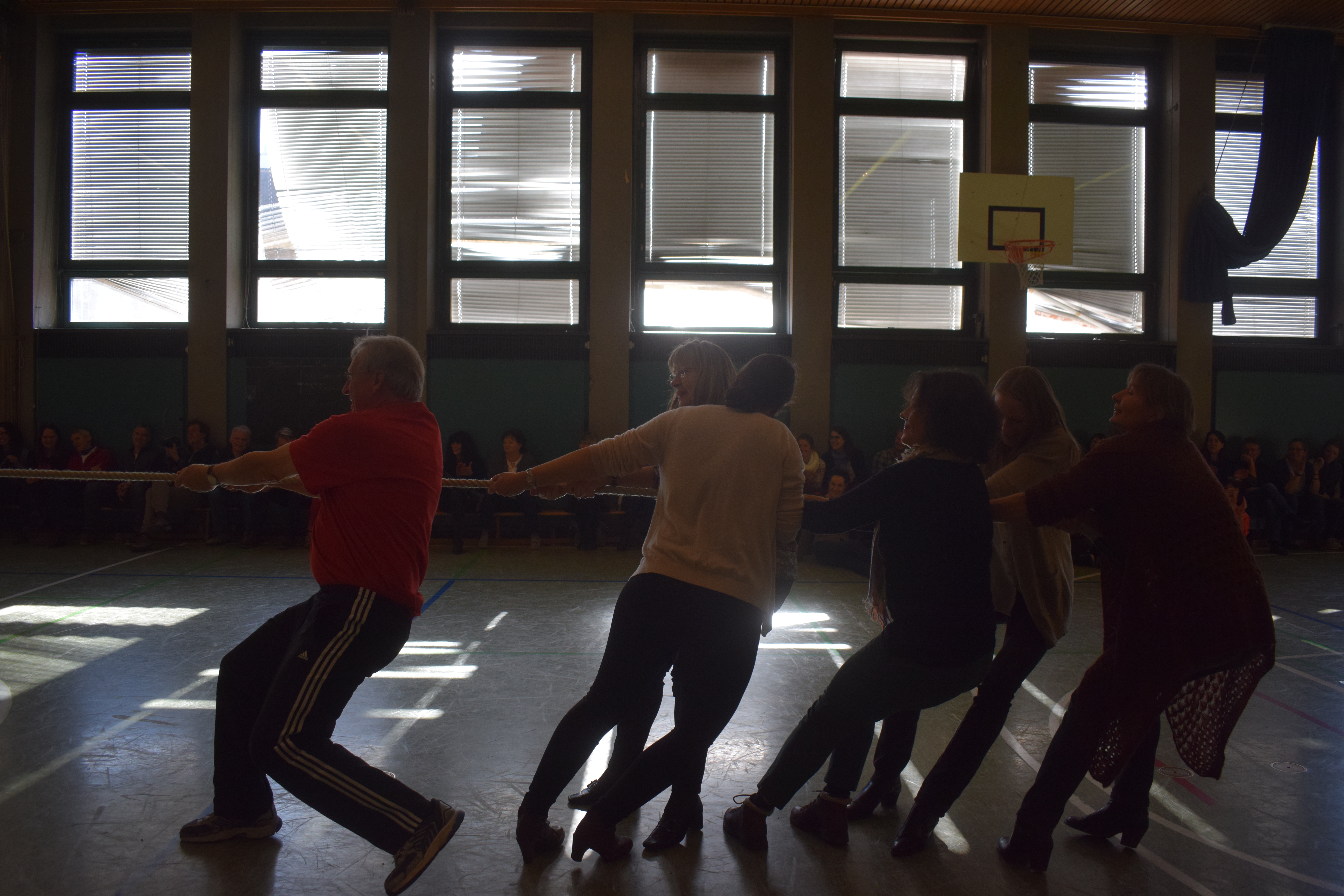 Unter der Moderation von Herrn Gangloff maß sich Herr Schuhknecht mit Herrn Fiedler im Körbewerfen, schoss 11-Meter gegen Herrn Hildensperger, zog (zusammen mit starken Frauen aus dem Kollegium) am Seil und stellte an Seite einer professionellen Tänzerin und ehemaligen Holbeinschülerin seine Tanz-Skills vor einer Jury (bestehend aus Herrn Stief, Herrn Link und Herrn Fiedler) unter Beweis. Als der sichtlich gerührte Sieger dann schließlich seine Preise entgegengenommen hatte, verlagerte sich die Veranstaltung in den Theaterraum im Altbau, wo eine Aneinanderreihung von Präsentationen, Film- und Livebeiträgen wartete.