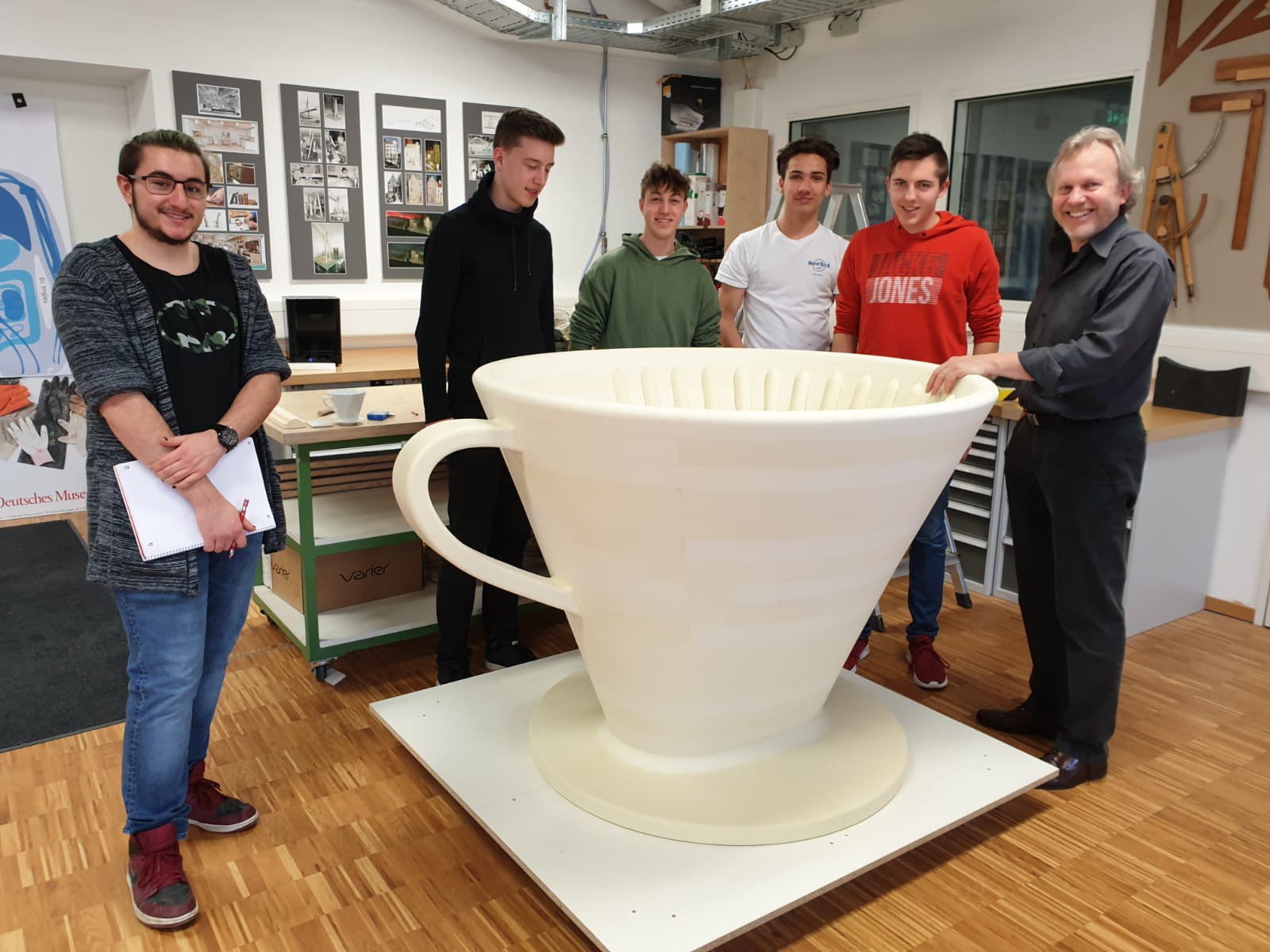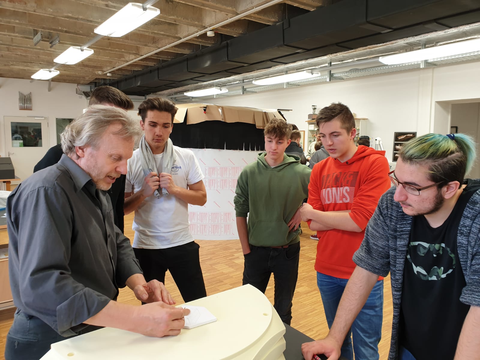 Dort sind wir auch gleich in die "Werkstatt” gegangen, wo wir uns mit Herrn Huber getroffen haben. Dieser hat jahrelange Erfahrungen im Modellbau und baut beruflich Modelle für das Deutsche Museum. Somit ist er eine hervoragende Ansprechperson für uns und war uns auch eine sehr große Hilfe. Wir konnten ihm viele Fragen stellen und haben auch einige Sachen bemerkt, über die wir vorher noch gar nicht so wirklich nachgedacht hatten. Wir haben einen Einblick in die Arbeit eines Modellbauers bekommen und haben vieles Hilfreiches für unser Vorhaben gelernt.