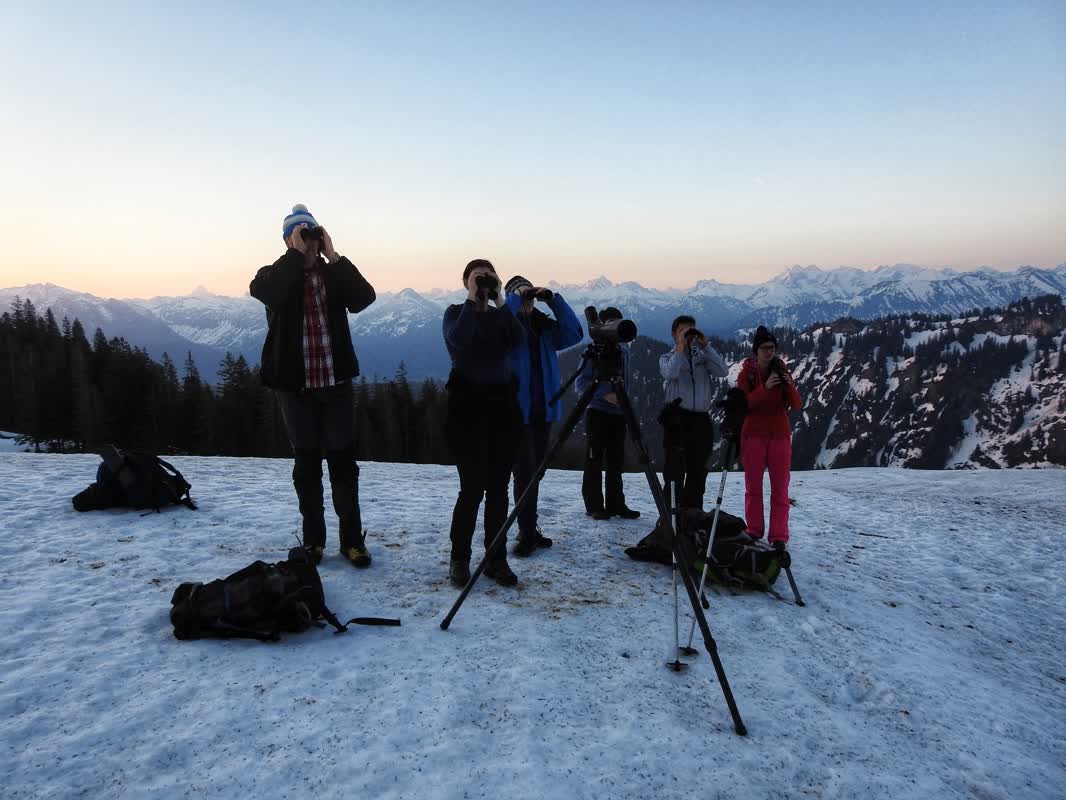 Zunächst stand eine eineinhalbstündige Autofahrt nach Grasgehren bevor, auf welcher manch einer nochmals ein wenig Energie tanken konnte. Dort angekommen hat sich die Gruppe mit Henning Werth, dem Gebietsbetreuer der Allgäuer Alpen und Mitglied des Landesbund für Vogelschutz (LBV), getroffen und ist zusammen mit ihm zum Birkhuhnbalzplatz gewandert.