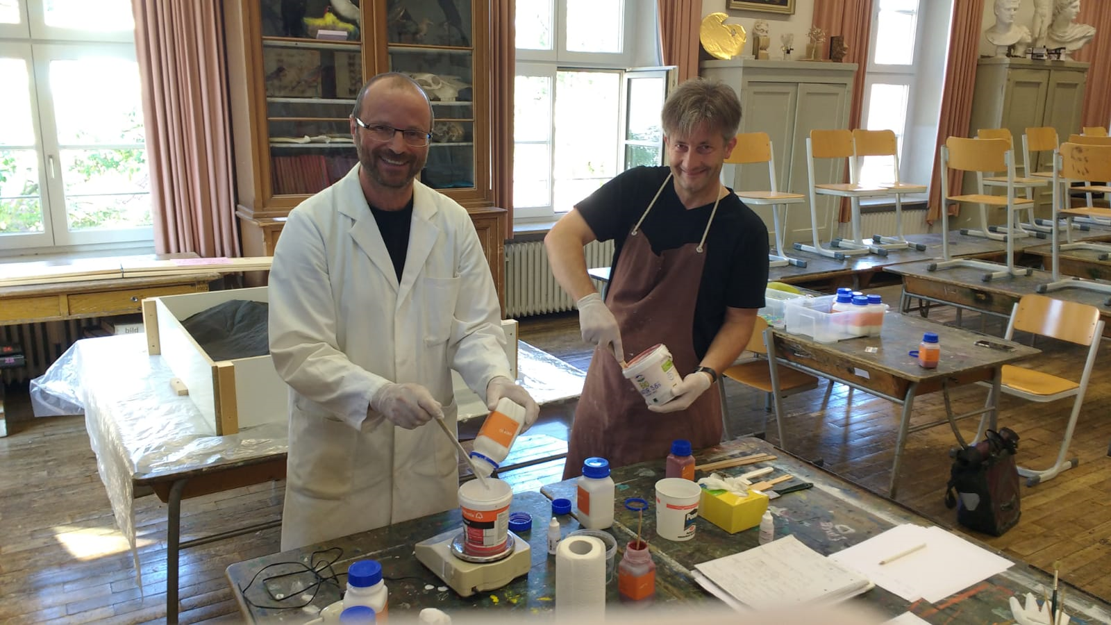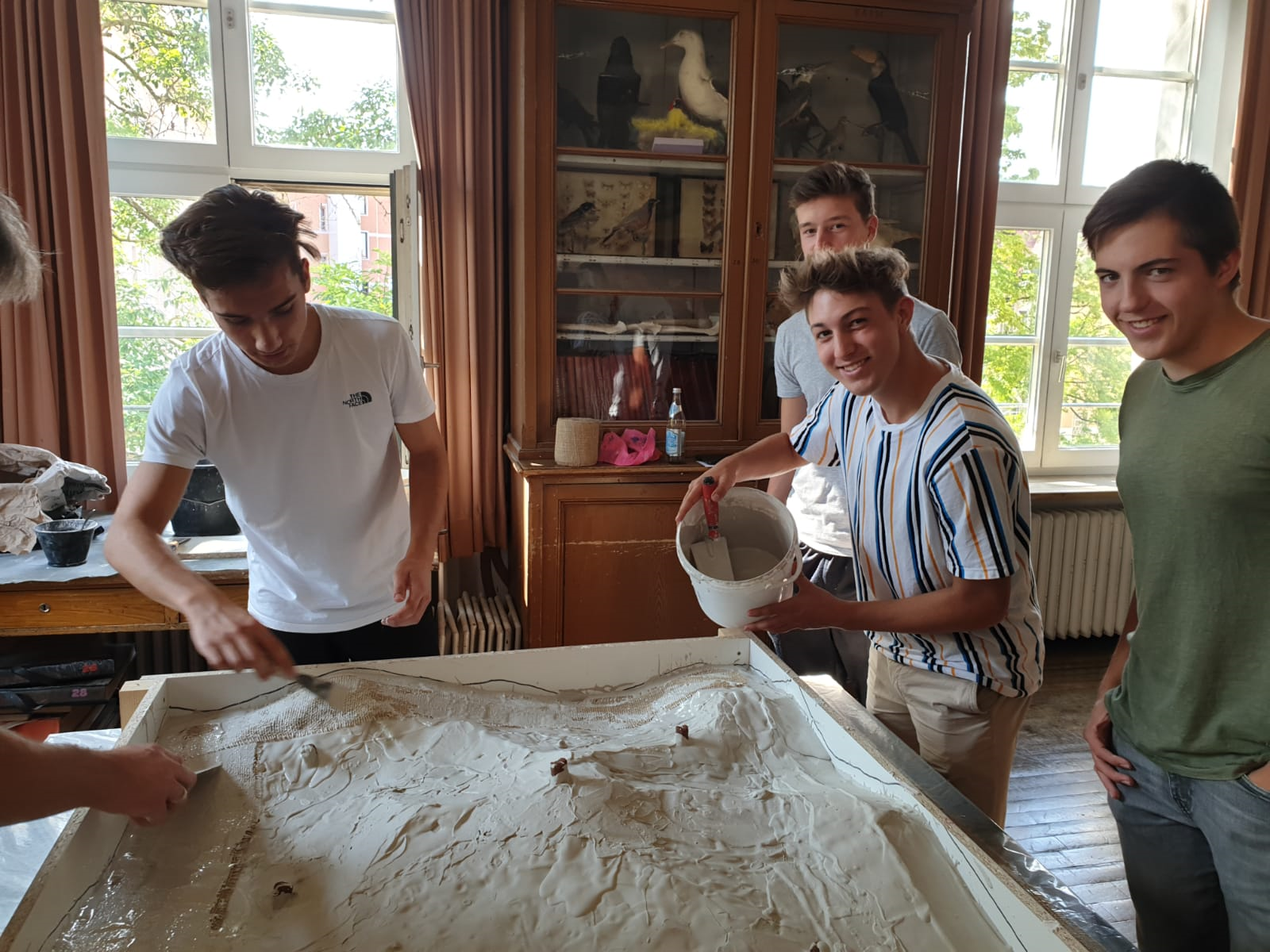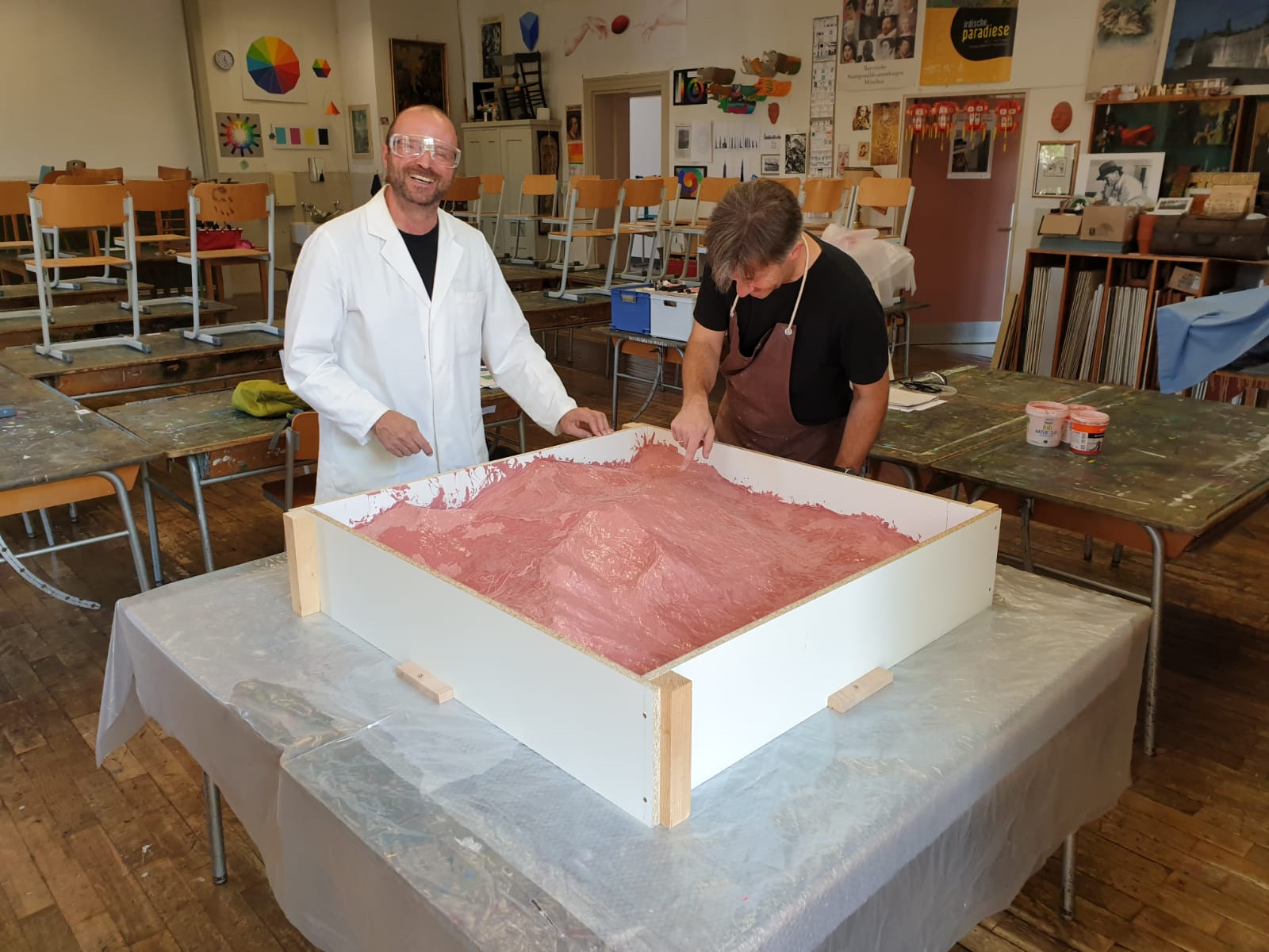 Doch wie oben schon erwähnt, war der bisher nur grau-schwarze Berg noch nicht unser fertiges Modell, sondern erforderte noch einige Handgriffe. So fertigte Herr Blachut zusammen mit unserem Kunstlehrer Herr Winter in den Sommerferien ein Silikon-Gips-Abguss an. Dabei wurde das Modell zunächst mit Gips beschichtet und anschließend mit Silikon, wodurch sich ein negativ-Abdruck des Modells ergab.
